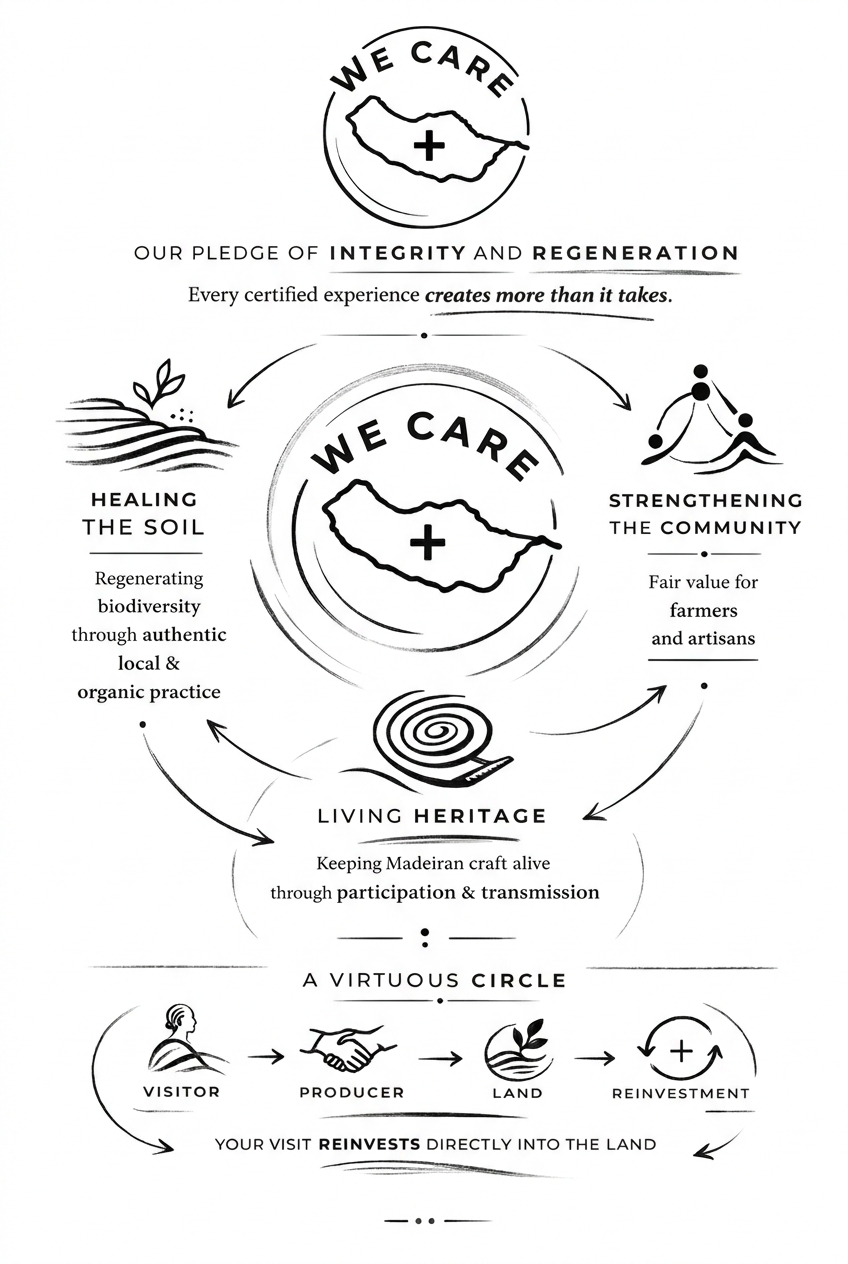 - The Tourist as a Partner: Within the We Care framework, the visitor is no longer a passive observer. By participating, the initiate is integrated as a co-regenerative partner, whose direct contribution sustains the system and allows for reinvestment in Calheta’s agricultural and human heritage.